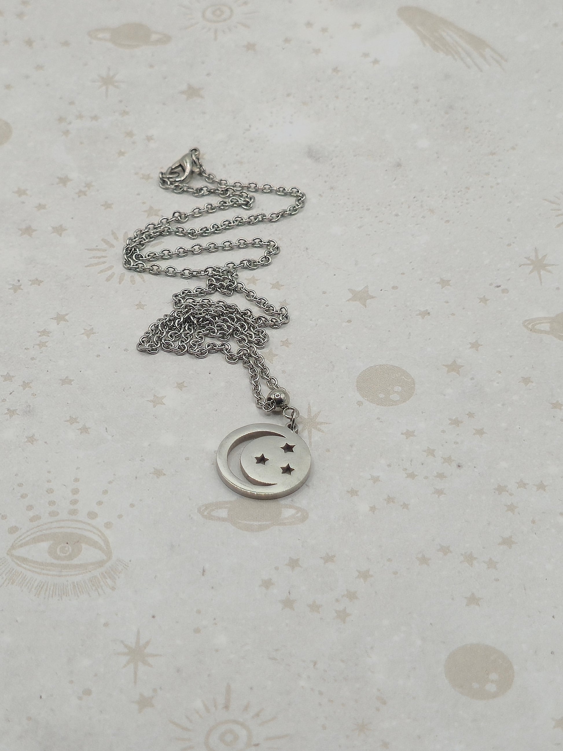 304 Stainless Steel Pendant Necklace, Flat Round with Moon and Stars, Stainless Steel Color, 18x16x1.5mm, Hole: 1.2mm