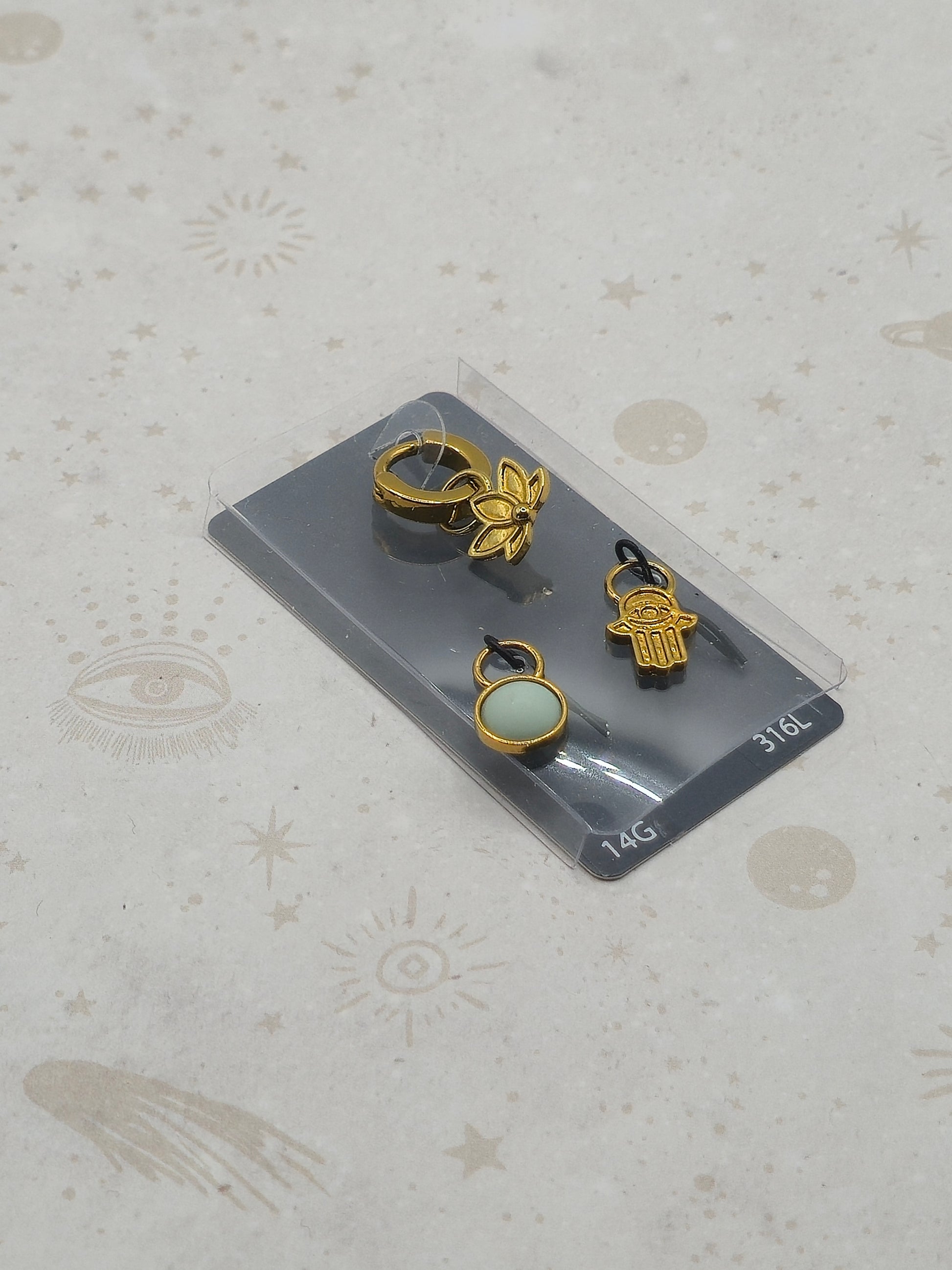 This earring comes with a set of 3 charms, including a lotus flower, a simple circle, and a Hamsa hand