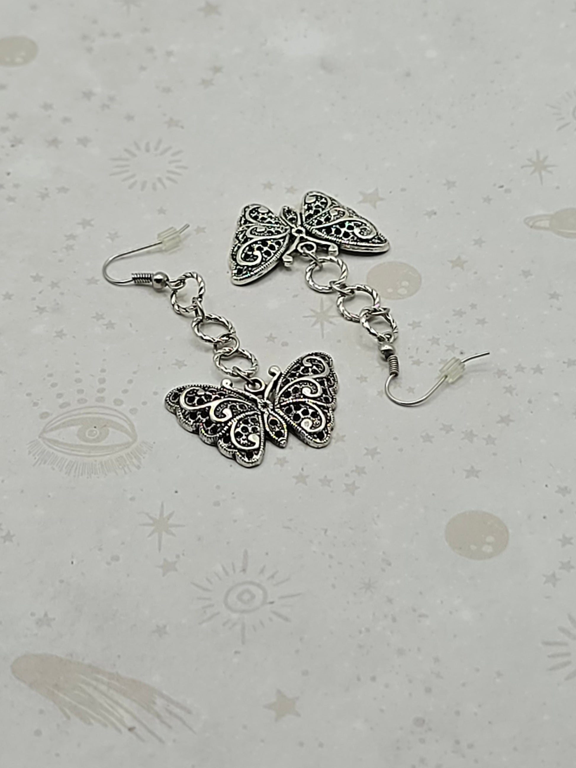 A butterfly pendant adorned with an intricate pattern hanging from 3 small jump rings, the earring is in the style of a hook